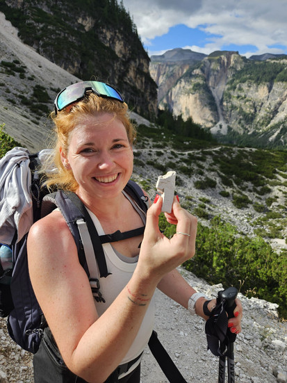 O poznání lepší spaní! Zima nebyla a na spacák jsem si zvykla. Nebo jsem byla unavená a už mi bylo všechno jedno... Tentokrát jsme ráno nepospíchaly a jak jsme snídaly, balily stan a čistily si zuby, tak nás všichni naši známí předešli. Vyspaly jsme se dobře, takže jsme vyrazily a další den, který měl být podle předpovědi poslední hezký. Cesta vedla spíš lesy a nahoru do skal jsme se docela dlouho nedostávaly. První jsme šly pořád dolů (což ale není tak super, protože kopec na který jsme měly dojít byl v dohledu a nízký nebyl) a pak jsme začaly stoupat. Mezicíl bylo jezero u kterého stála samozřejmě jedna chata s dobrým jídlem. Původně jsme se chtěly v jezeře vykoupat, protože sprchu jsme od prvního jezera nepotkaly, ale bylo celé prorosté, tak jsme se spokojily s panini a borůvkami se šlehačkou na chatě. Našly jsme tu i tradiční bonbonky, které jsme si obě nakoupily domů jako suvenýry (příchuť aperol nezklamala!). Cesta pokračovala nahoru dál přes kopec a pak zase dolu. Chvílema to byly cesty jak na Šumavě, ale odkrývaly se ty nejkrásnější výhledy.