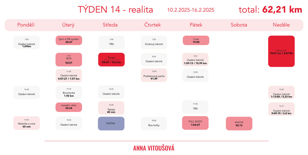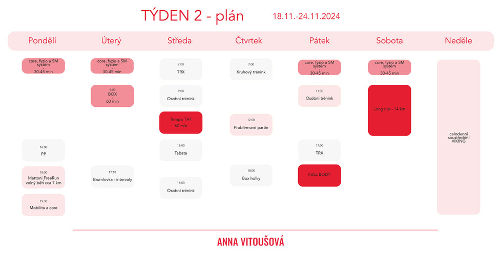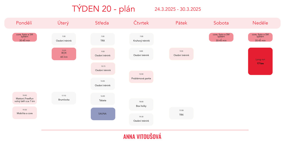 Plán je takový, že chci mezi všechny tréninky v týdnu nacpat ještě 3 svoje běhy (které budu muset asi trochu interaktivně rozmisťovat jako to půjde), 2 svoje silové tréninky, každé ráno kdy nemám trénink cca 30 min fyzio cvičení a 2x trénink boxu.